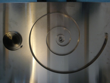 Another reason to remove mainsprings is to check that they are still in good condition and powerful enough to run the clock. Over time springs will permanently “set” and their output will be much reduced. The picture to the left shows two springs of the same dimensions (thickness, width, length). The one on the left is the old spring taken from the clock and the one on the right is the equivalent new spring which opens up far more.