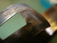 The picture above shows a mainspring where the eye that holds the spring has begun to tear. If left the spring could fail completely and the resulting shock through the train can cause extensive damage to many components of the clock. The picture to the right shows where this has happened. Looking closely it can be seen that the steel arbor has been bent by the force of the spring unwinding suddenly. This illustrates why it is important that mainsprings are always removed during servicing and checked for the early signs of failure. Failures of this kind cannot completely be eliminated but I always remove, clean and check mainsprings to reduce the risk of it happening.