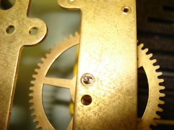 The picture to the left shows where a pivot has worn significantly in the bearing. The wear has elongated the bearing hole so that the pivot is no longer held firmly in the position it was designed to be. Below is a side view of the pivot which is also badly worn. This degree of wear can result from a pivot running without proper, clean lubrication. A dry, dirty pivot hole will increase the speed that wear occurs. In extreme cases the wear can cause the teeth of the wheel or pinion to lose mesh with the neighbouring wheel or pinion. If this happens then the clock can run away in an uncontrolled manner and serious damage can be caused by the force of the spring or weight driving the clock. When the wear to the pivot gets too great to remove by refinishing its surface then the pivot can be cut off the end of the arbor and replaced.